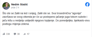 Najava Nedima Sladića o vremenskim prilikama zasigurno će obradovati veliki broj građana Bosne i Hercegovine koji su se u proteklim sedmicama suočavali s problemima koje su donijeli snijeg i led.