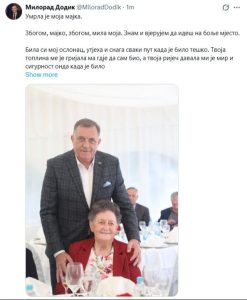 Lideru SNSD-a Milorad Dodik preminula je majka, o čemu je obavijestio javnost putem društvenih mreža.