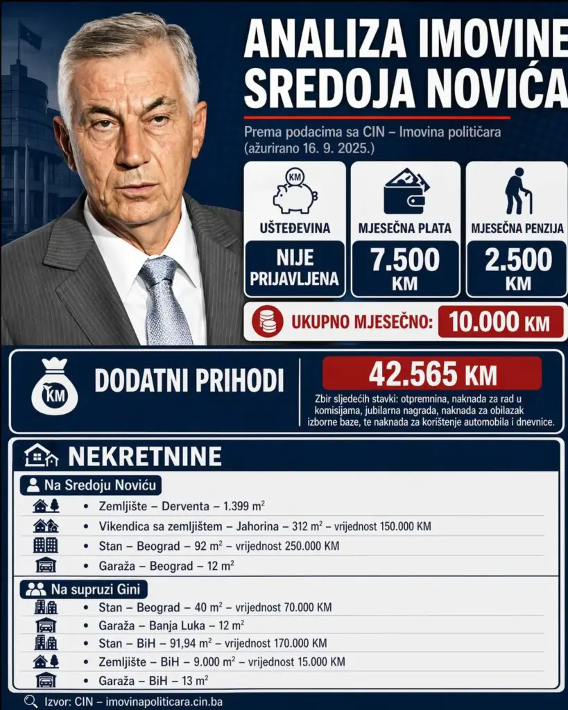 Za Sredoja Novića navodi se da ušteđevina nije prijavljena, dok njegova mjesečna primanja također iznose oko 10.000 KM, uz dodatne prihode procijenjene na 42.565 KM.