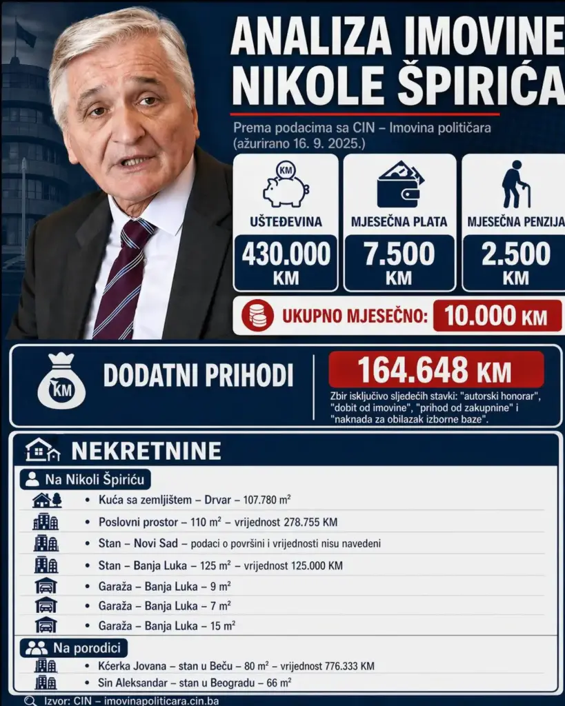 Prema podacima na koje se pozivaju, Nikola Špirić raspolaže ušteđevinom od oko 430.000 KM, dok njegova mjesečna primanja iznose približno 10.000 KM, uključujući platu i penziju. Također su navedeni i dodatni prihodi u iznosu od 164.648 KM, koji uključuju različite vrste naknada.