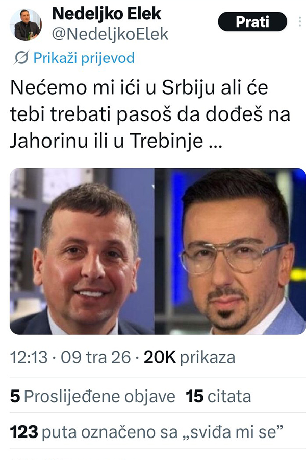 Ne stišavaju se reakcije javnosti nakon istupa Nedeljka Eleka, počasnog konzula Bjelorusije u Bosni i Hercegovini, direktora kompanije BH Gas Istočno Sarajevo i predsjednika Nadzornog odbora Olimpijskog centra Jahorina.