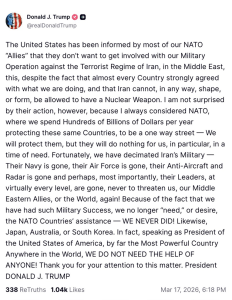Trump je istakao da takav stav partnera za njega nije iznenađenje, te je ponovio svoj raniji stav o ulozi saveza. NATO je opisao kao “jednosmjernu ulicu”, naglašavajući da SAD ulaže značajna sredstva u sigurnost drugih, dok, kako tvrdi, podrška u ključnim trenucima izostaje.