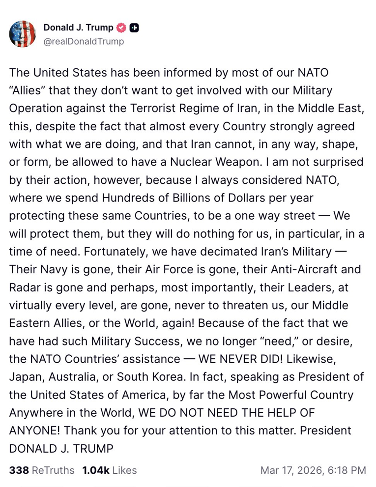 Američki predsjednik Donald Trump oglasio se putem društvenih mreža, navodeći da su Sjedinjene Američke Države obaviještene kako se većina saveznika ne želi uključiti u operaciju vezanu za sigurnost u Hormuškom tjesnacu.