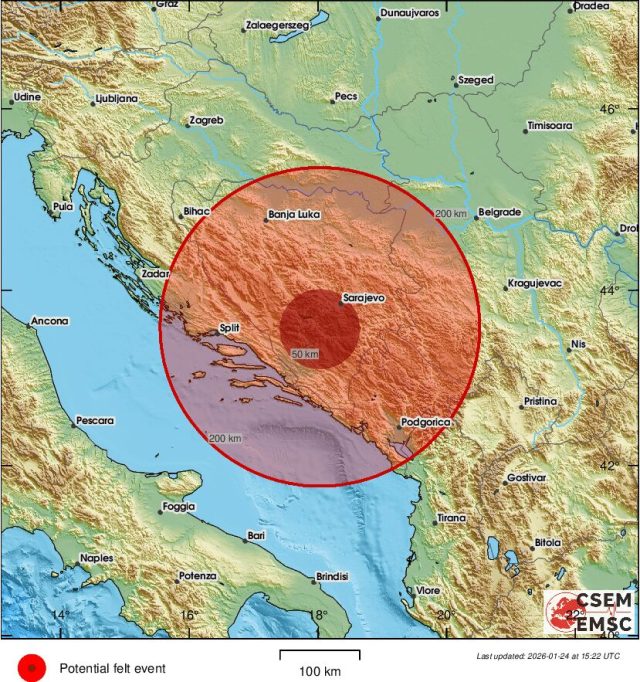 Evropsko-mediteranski seizmološki centar (EMSC) i sinoć je objavio informaciju o mogućem zemljotresu u Bosni i Hercegovini, zasnovanu na prijavama korisnika. Prema navodima građana Mostara, osjetilo se kratkotrajno podrhtavanje tla.